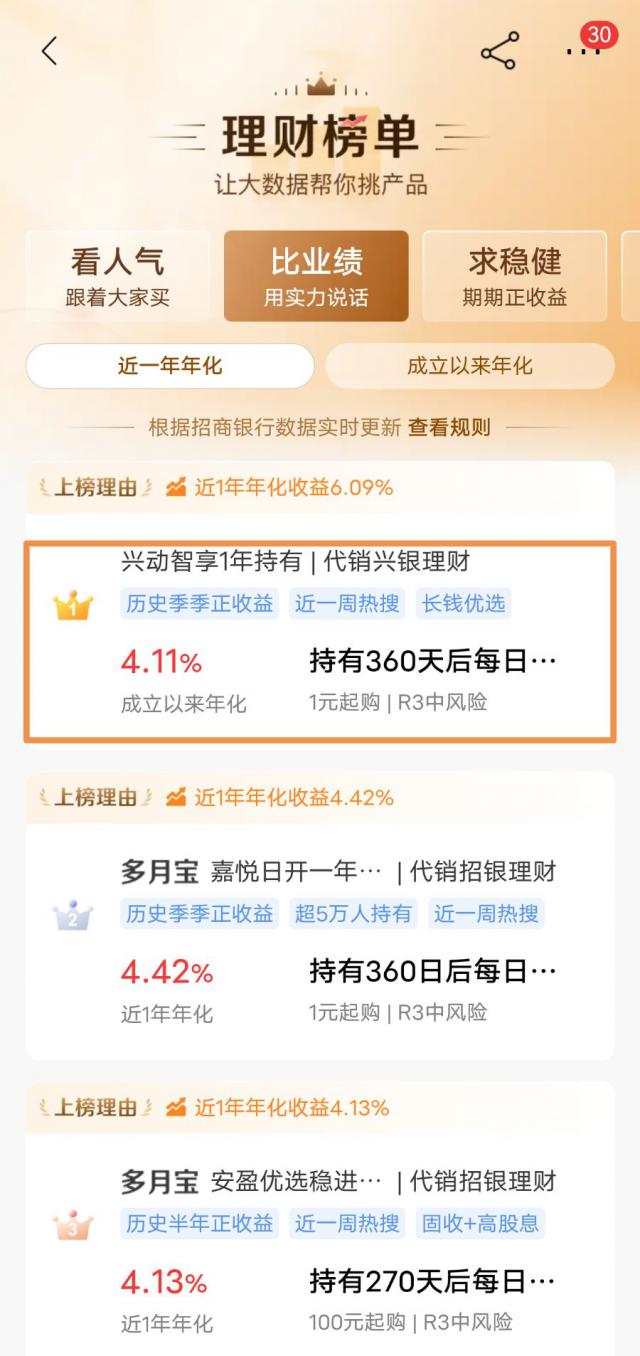 21 世纪资管研究院研究员 唐曜华 实习生 姜博文 近期股市突破 3600 点后小幅震荡,债市在上周调整后本周略有反弹。部分含权比例 10% 左右的"固收 + 权益"类产品近期收益表现亮眼。理财通评评"理"第 45 期继续测评银行热销产品,本期测评招行 APP 业绩榜排第一的产品:兴银理财丰利兴动智享 1 年持有期 4 号 A。