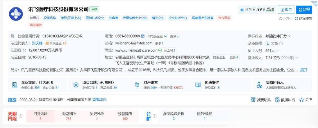 比如天眼查APP显示:科大讯飞旗下的讯飞医疗科技(HK:02506),其依托的就是专业垂直的星火医疗大模型,推出的讯飞晓医APP同样具备症状自查、中医辨证、报告解读和健康档案管理等功能,整体AI表现也似乎已经逐渐追赶上了微脉……